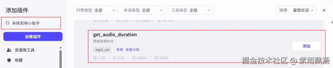 在循环体里的语音合成节点后面添加一个米核的 【剪映小助手】 的 【get_audio_duration】节点->设置参数;