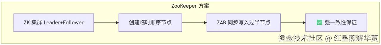 - 临时节点:客户端会话断开时,ZK 自动删除节点,锁自动释放,绝不死锁。