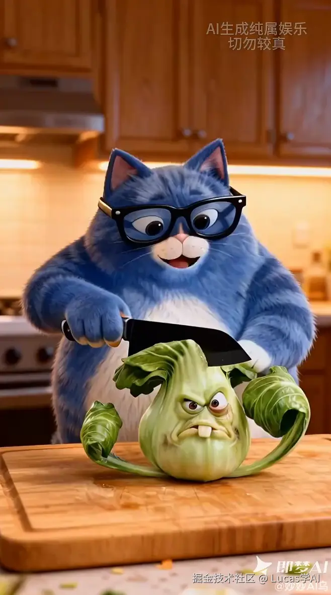 高质量3D动画风格,皮克斯动画电影质感。一只毛茸茸的拟人化胖蓝猫,戴着时尚的黑框眼镜,专注地站在木质案板前,手里拿着一把黑色菜刀。它正切向一颗雕刻出了滑稽丑陋愤怒表情的拟人化白菜,白菜露出一颗大板牙,表情极其生动,叶子弯曲像手臂一样。案板上的木纹清晰,蓝猫爪子下方有白色文字“兄弟们”。厨房背景模糊,有木质橱柜和家电。右上角有白色中文文本“AI生成纯属娱乐,切勿较真”。