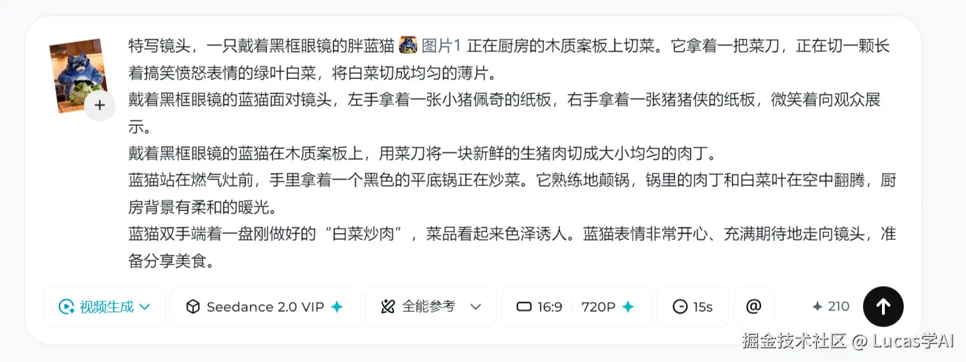 过去你只能给一段文字提示词。现在你可以同时上传:一张角色图(锁定长相衣服)+ 一段参考视频(锁定运镜风格)+ 一段音频(锁定节奏)+ 文本指令。模型会综合这四种信息生成视频。这就是“全模态”的含义。