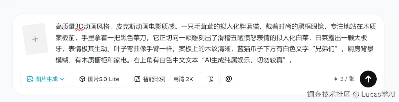 - 写实要强调“电影质感、8K、真实光影”;卡通要强调“皮克斯风格、明亮色彩、夸张表情”。