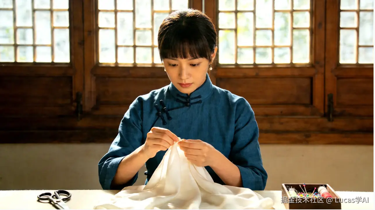 年轻女裁缝,鹅蛋脸,齐刘海,穿靛蓝色盘扣上衣,坐在木窗前,手里拿着白色丝绸,桌上放着剪刀和针线盒,暖黄灯光,电影质感,8K