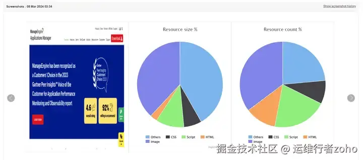 与仅模拟浏览器行为的合成监控不同,Applications Manager使用真实浏览器收集指标,包括网络延迟、内容校验和网页元素可用性,提供更精准、可靠的数据。 - 全面的网页渲染能力