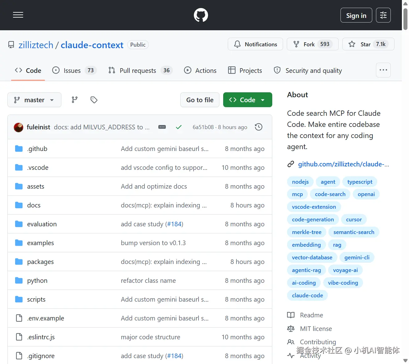 上面这张图对应的是 zilliztech/claude-context 的仓库页面。