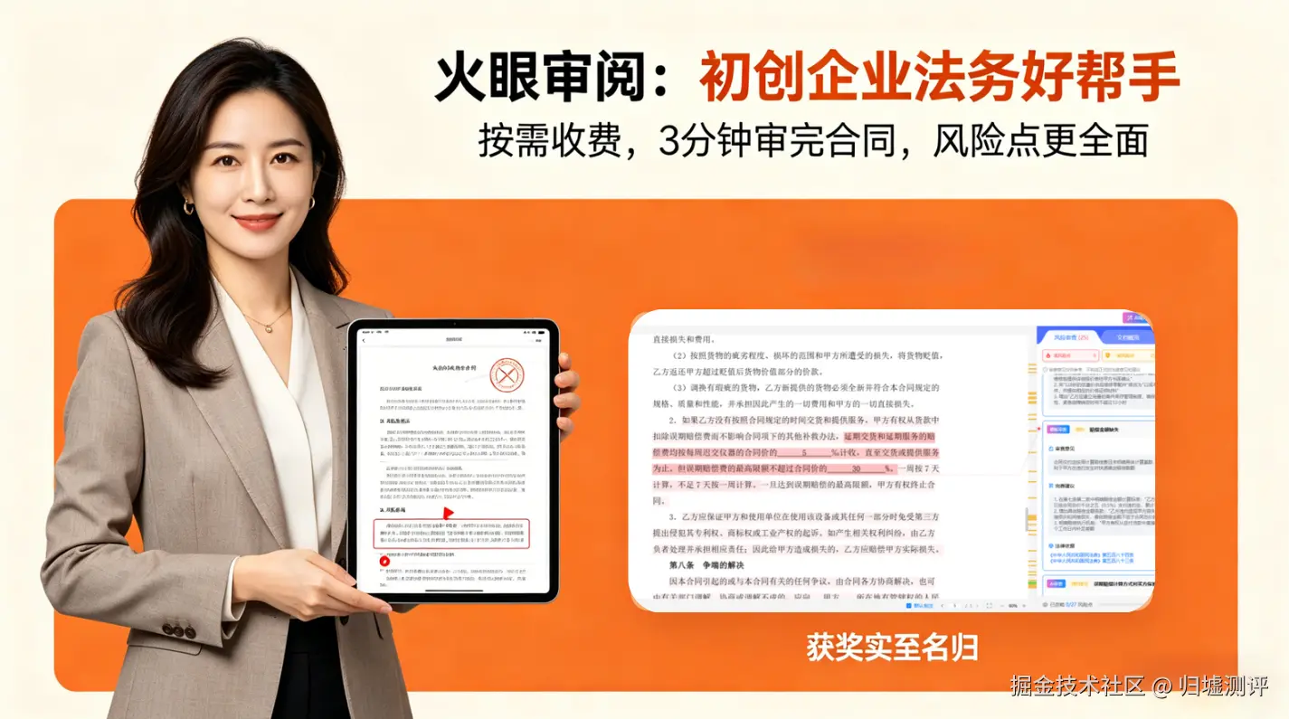 初创企业法务林女士:我们公司合同不多,买年卡太浪费。火眼审阅按需收费刚好,3 分钟审完一份合同,风险点比我审得还全,获奖确实实至名归。