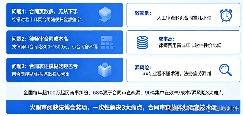 火眼审阅能获得法博会奖项,正是因为它一次性解决了这 3 个痛点,让合同审查从 "体力活" 变成 "技术活"。