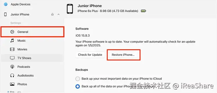 对于 Windows 用户来说,Apple Devices 应用的功能与此相同。另外,请注意,苹果公司已停止对 iTunes 的更新,Apple Devices 应用正在逐步取代 iTunes。
