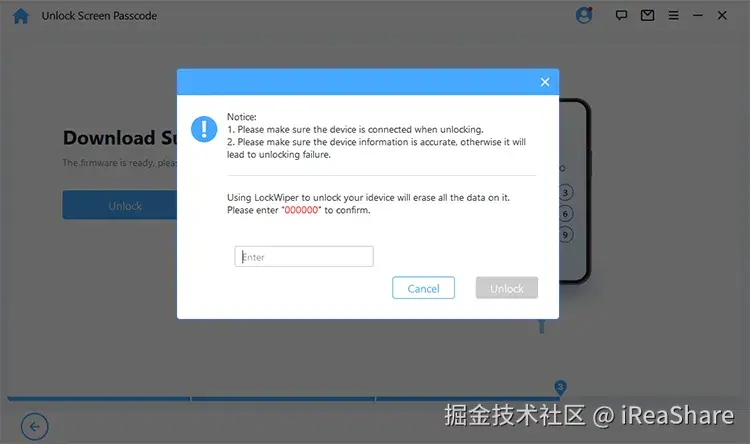 等待程序下载并验证固件。然后点击“解锁”。在弹出的窗口中,输入“ 000000 ”,然后再次点击“解锁”。软件将开始移除屏幕锁。完成后,您就可以在没有屏幕锁的情况下访问您的设备了。