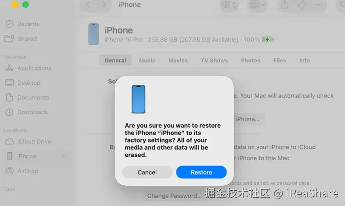 打开 Finder,从侧边栏选择你的 iPhone。此时会弹出提示,询问你是否要恢复设备。选择“恢复”。
