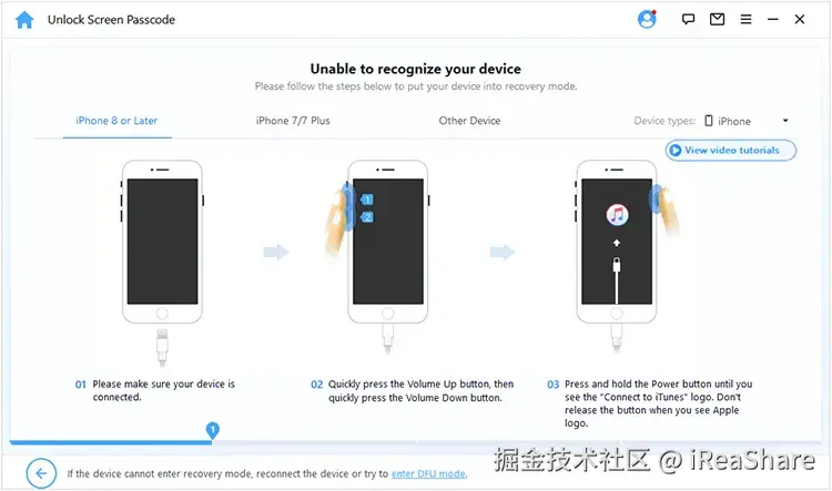 点击“开始”,然后用 USB 数据线将 iPhone 连接到电脑。接着选择您的设备型号,并按照屏幕上的指南将 iPhone 进入恢复模式。