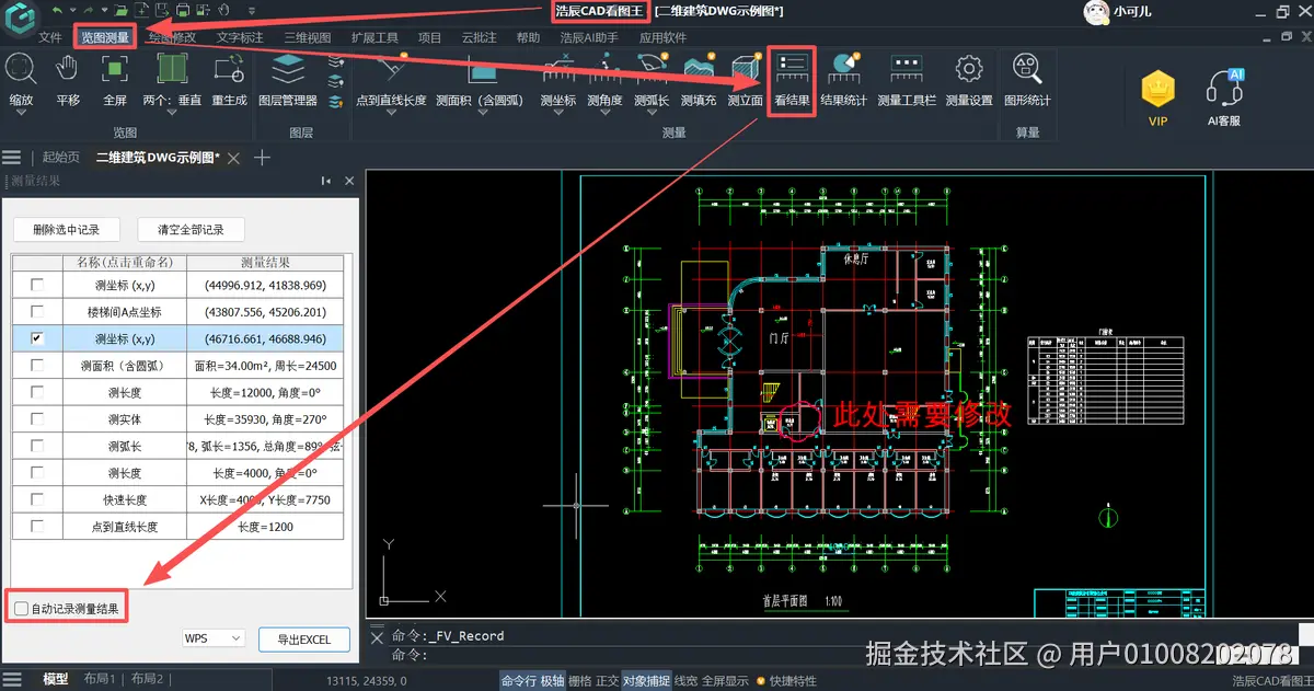通过顶部菜单栏【览图测量】→【测量】栏→选择【看结果】功能,系统自动加载所有历史测量记录(含长度、面积、体积等标注数据)。