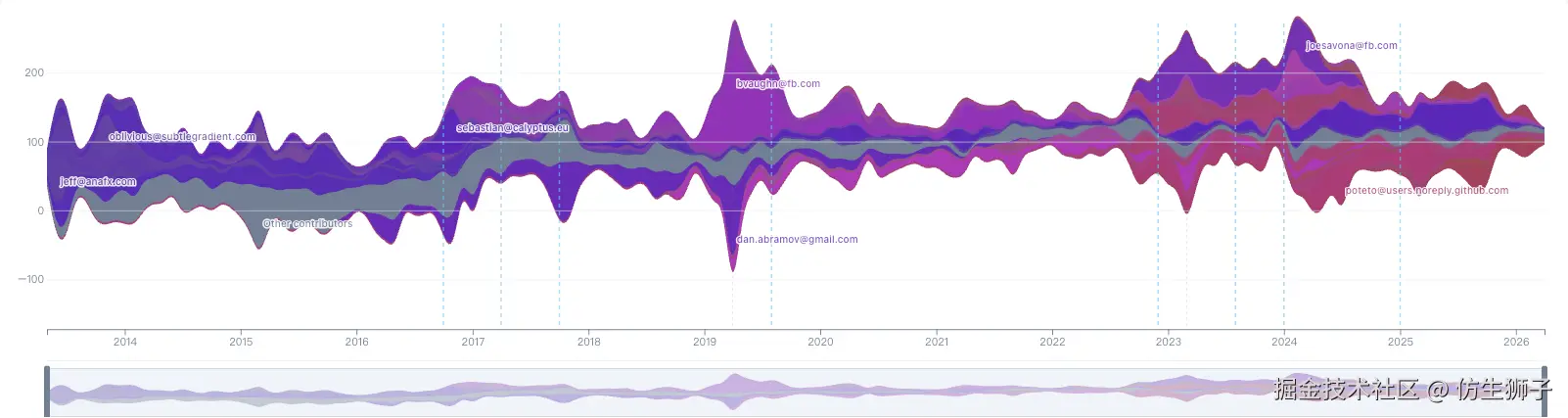 和 Vue 不同,React 没有一条独大的色带。多条宽带交替出现,反映出 Facebook 内部多人协作的模式。每年的 React Conf 前后都能看到提交量的明显脉冲。