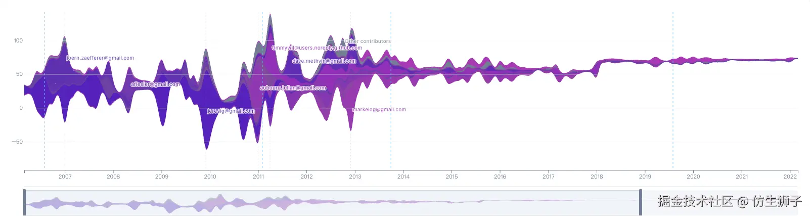 河流越宽,说明当天的提交越多。每条色带是一位贡献者,一眼就能看出"谁在写代码"、"社区什么时候开始膨胀"、"核心作者跑了没有"。