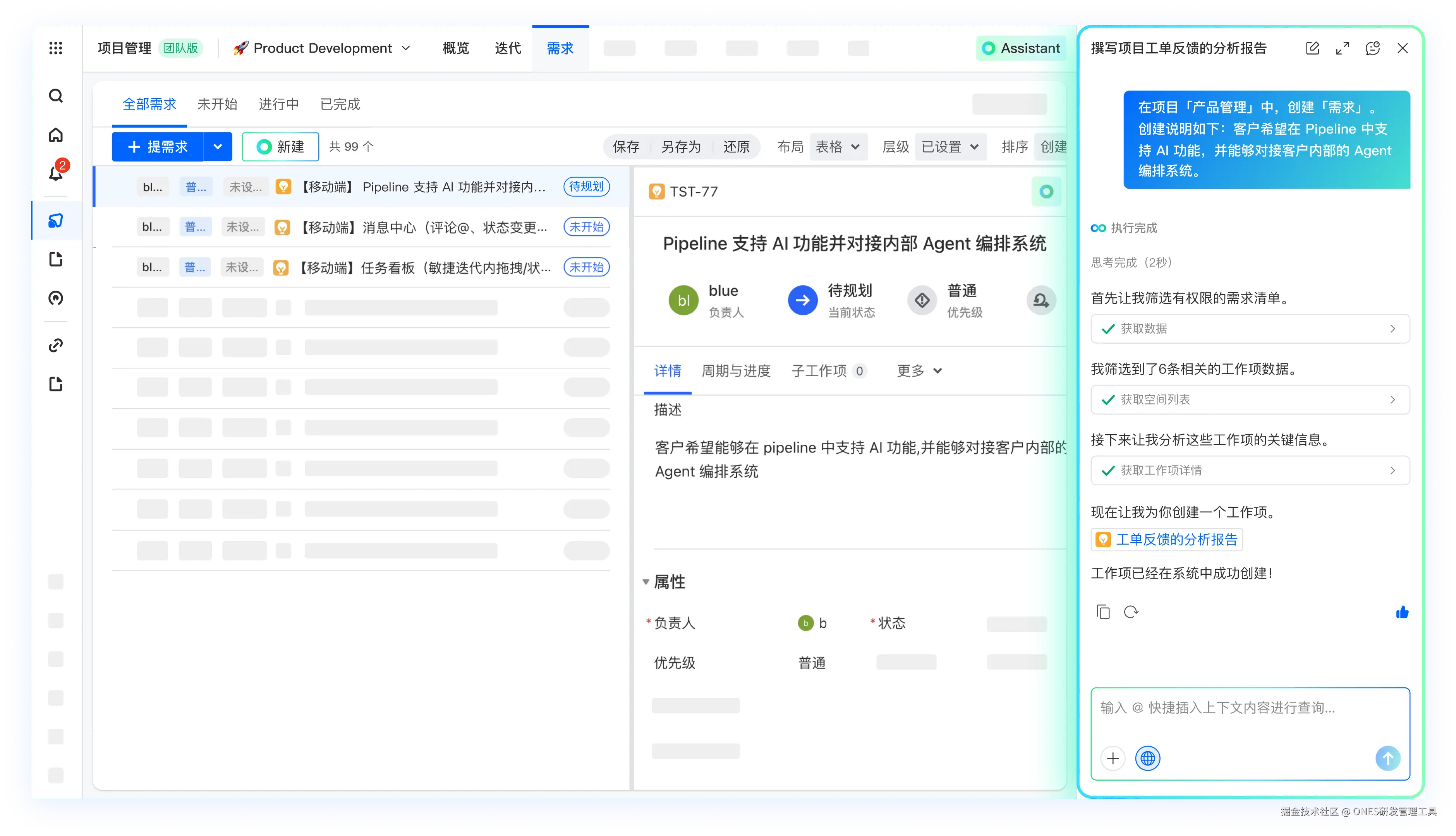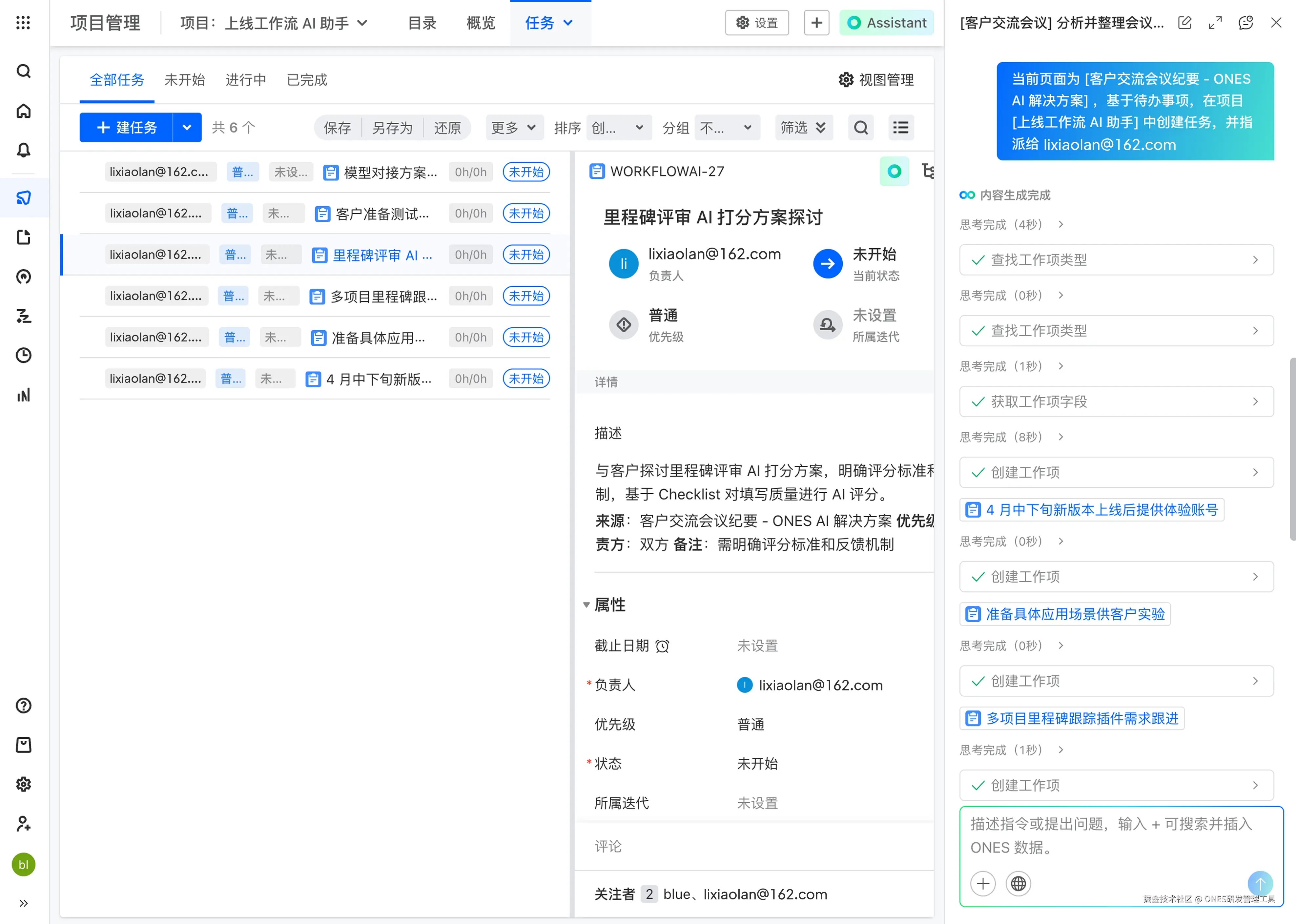 围绕客户会议中的零散反馈,ONES Assistant 能结构化提炼需求与工单,帮助团队加快整理、拆解与录入。