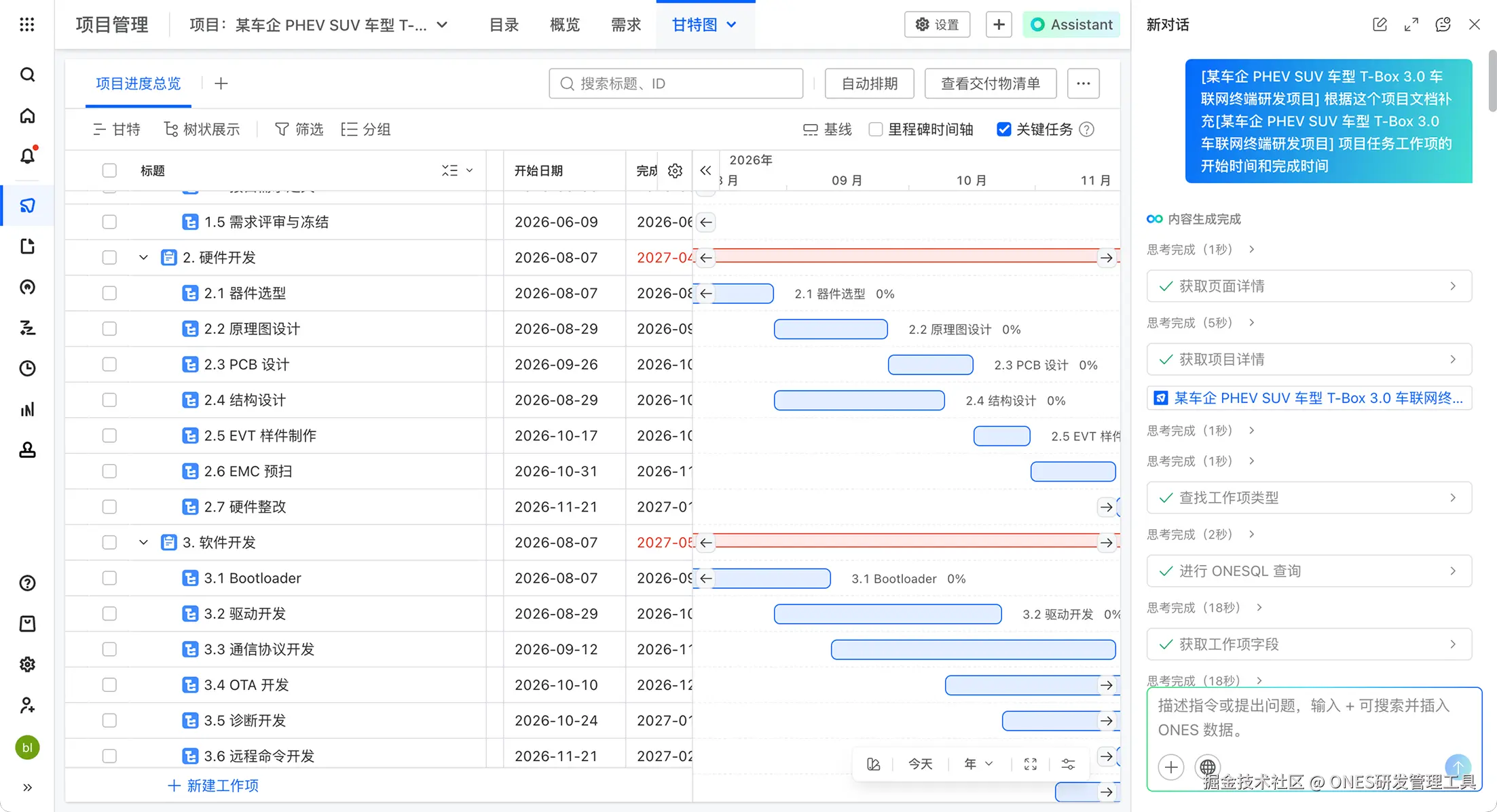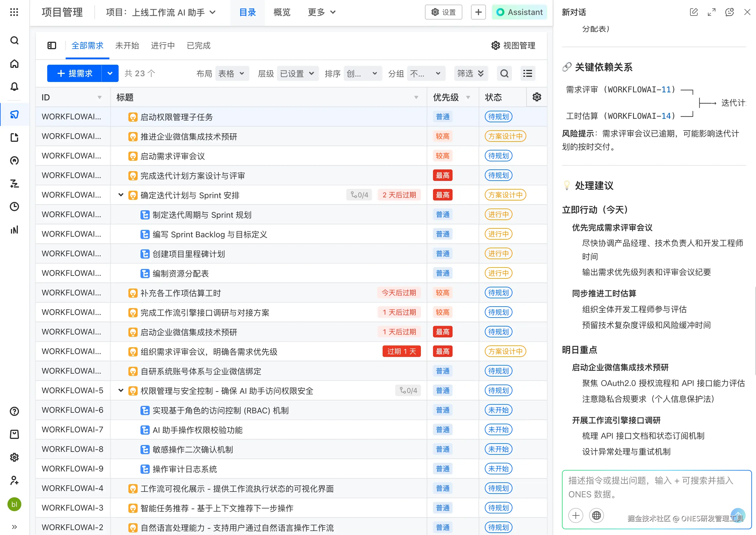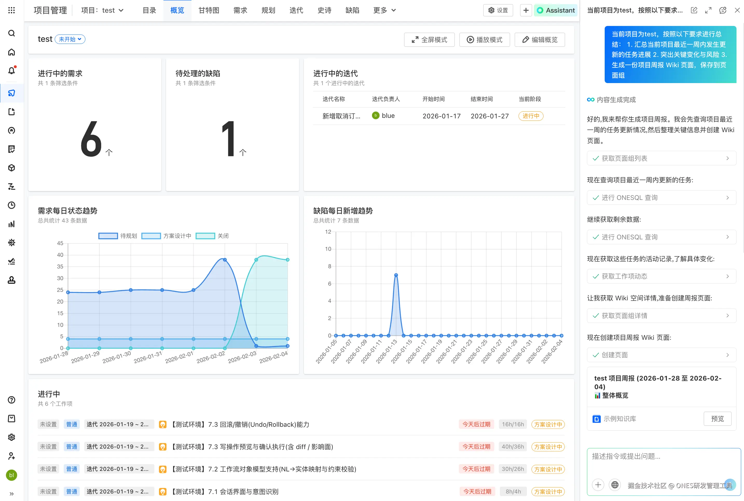 ONES Assistant 覆盖企业研发管理全流程,让 AI 深度参与项目信息连接、任务推进、知识沉淀和决策支持,帮助企业更快更稳完成产品交付。团队可结合技能化模板和平台扩展能力,持续沉淀组织最佳实践。