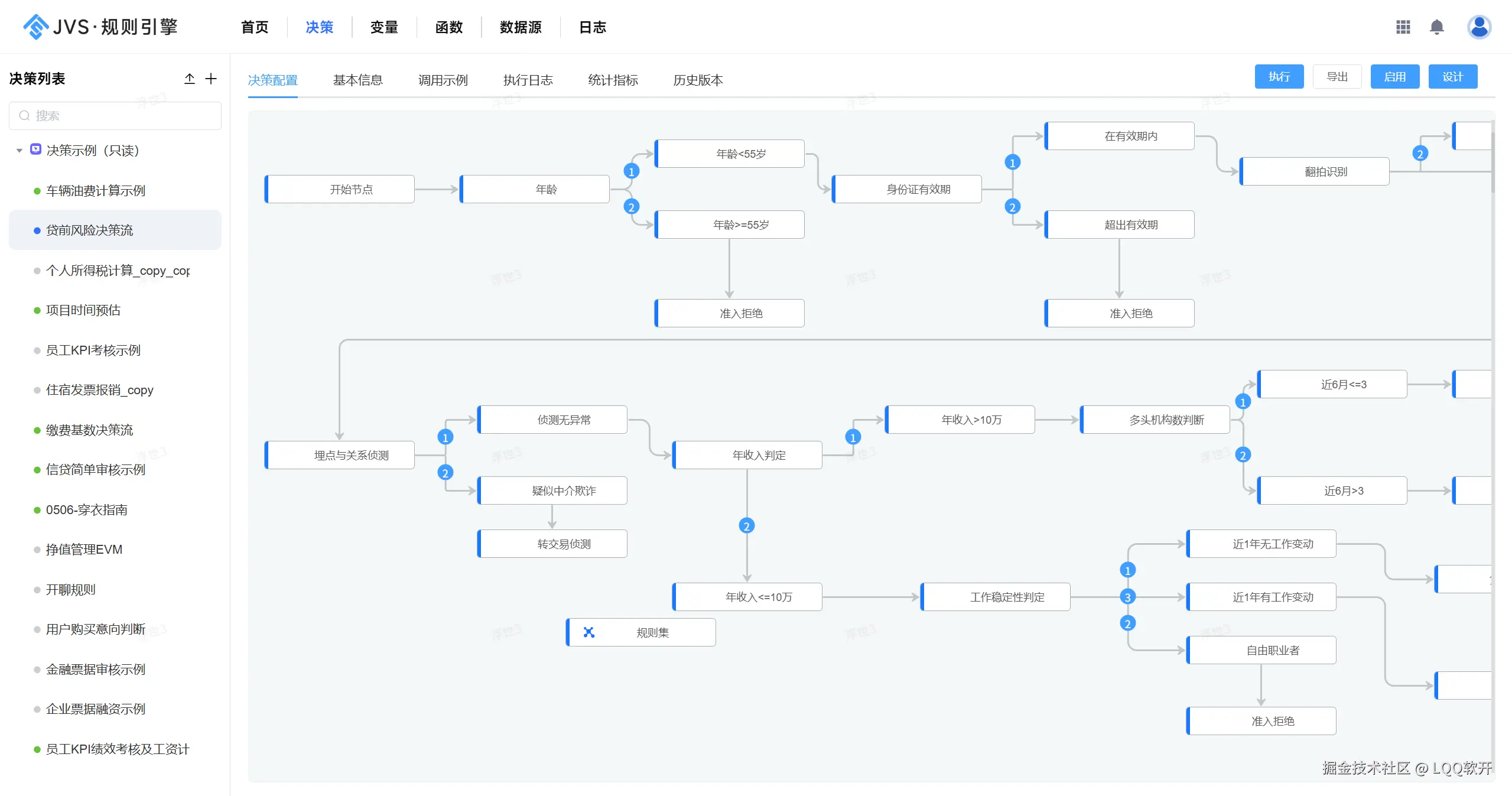 常用的建模方式包括决策流、决策表、评分卡、决策树等,可根据不同业务场景灵活选用。例如,在客户信贷审批场景中,可轻松编排一套完整的决策流:
