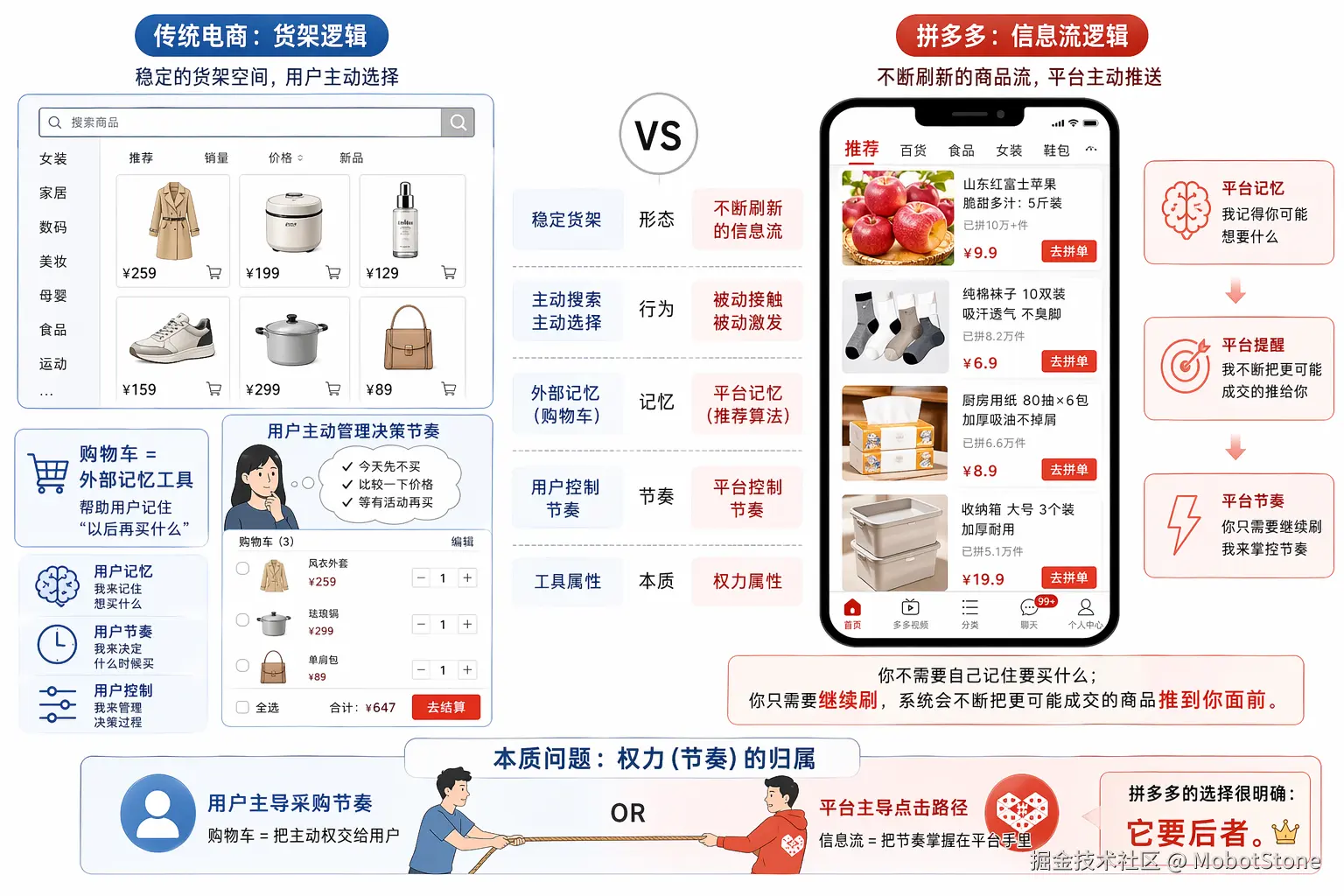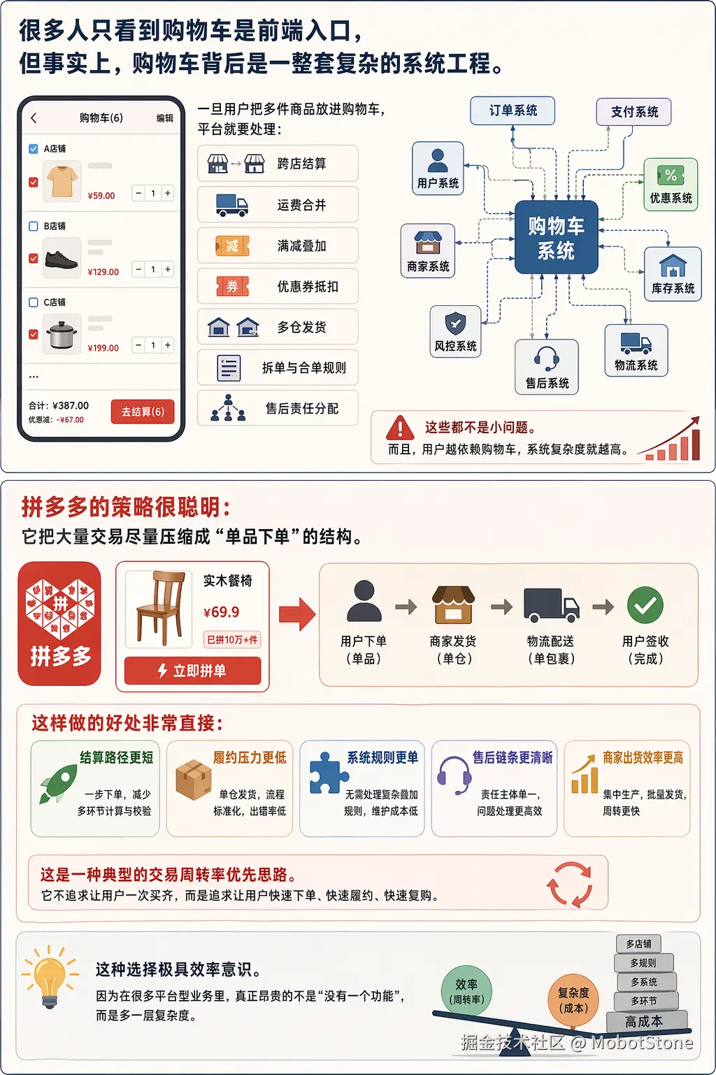 如果只从产品表面看,拼多多似乎“没有购物车”。 但这其实是一个常见误解。 拼多多不是完全取消了“暂存”和“结算”能力,而是把传统电商里由购物车承载的一整套功能,拆散并重新分配到了不同入口里:收藏、直接购买、拼单、合并付款、推荐流。 所以更准确地说,拼多多不是“少了一个购物车”,而是故意降低了购物车在交易链路中的中心地位。 这不是简单的产品简化,而是一种很典型的商业系统设计: 它要优化的,不是“用户是否方便整理商品”,而是平台如何更快、更稳定、更低成本地把流量转化为订单。