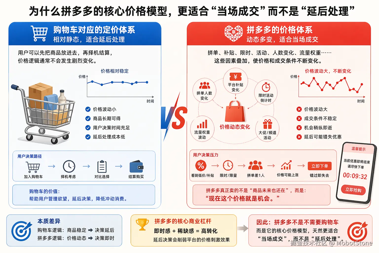 所以从定价体系来看,拼多多不是不需要购物车,而是它的核心价格模型,天然更适合“当场成交”,而不是“延后处理”。