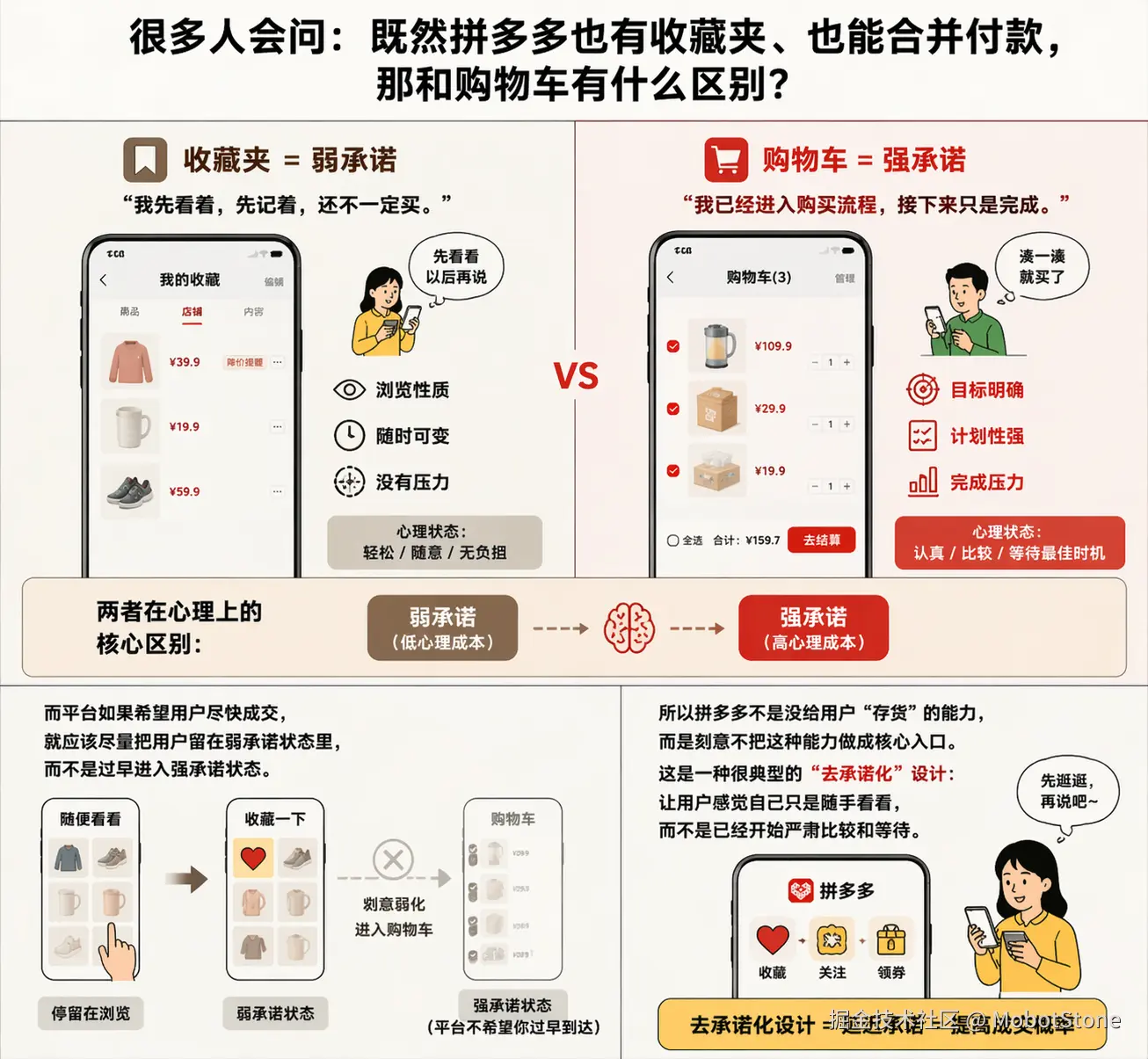 很多人会问:既然拼多多也有收藏夹、也能合并付款,那和购物车有什么区别? 区别在于,收藏的承诺强度更低。 “收藏”意味着: 我先看着,先记着,还不一定买。 “购物车”意味着: 我已经进入购买流程,接下来只是完成。 这两个动作在心理上完全不同。 前者是弱承诺,后者是强承诺。 而平台如果希望用户尽快成交,就应该尽量把用户留在弱承诺状态里,而不是过早进入强承诺状态。 所以拼多多不是没给用户“存货”的能力, 而是刻意不把这种能力做成核心入口。 这是一种很典型的“去承诺化”设计: 让用户感觉自己只是随手看看,而不是已经开始严肃比较和等待。