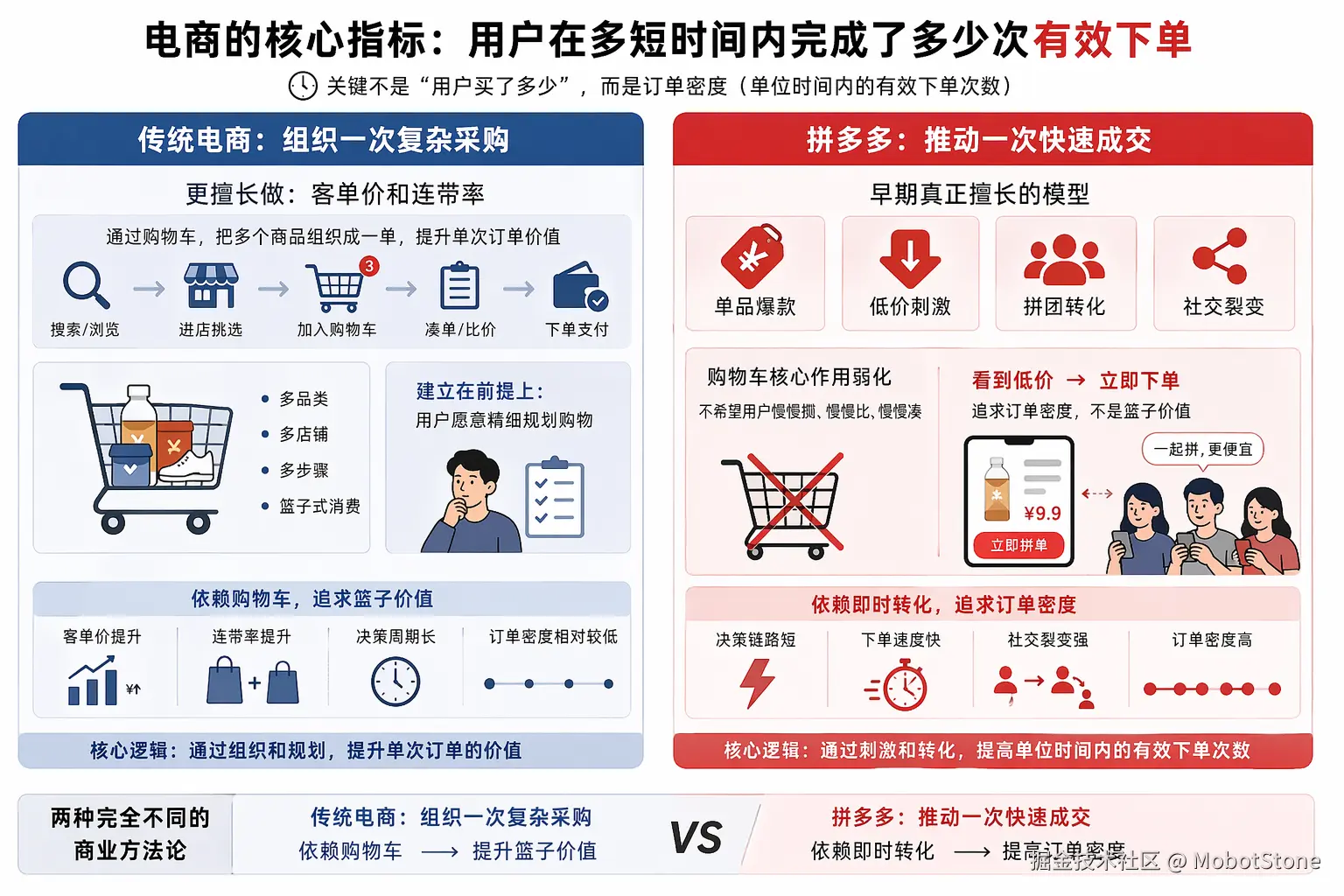 换句话说,拼多多追求的是订单密度,不是传统意义上的“篮子价值”。