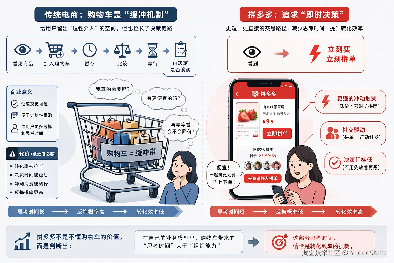 在传统电商里,购物车最核心的价值,从来不只是“放东西”。 它真正承担的是一个缓冲机制:看见商品 → 加入购物车 → 暂存 → 比较 → 等待 → 再决定是否购买这套链路的商业意义在于,它给用户留了一个“理性介入”的空间。 而这个空间越大,用户的反悔概率就越高。 从平台角度看,购物车实际上是一种“低效但必要”的设计: 它让成交变得更可控,也让用户有更多机会做计划性采购,但代价是——转化率被拉长,决策时间被延后,冲动消费被稀释。 拼多多显然不想把自己的核心交易路径建立在“延迟决策”上。 它更倾向于一种更短、更直接的模式:看到 → 立刻买 / 立刻拼单这意味着,拼多多不是不懂购物车的价值,而是判断出: 在自己的业务模型里,购物车带来的“思考时间”大于“组织能力” 。 而这部分思考时间,恰恰是转化效率的损耗。