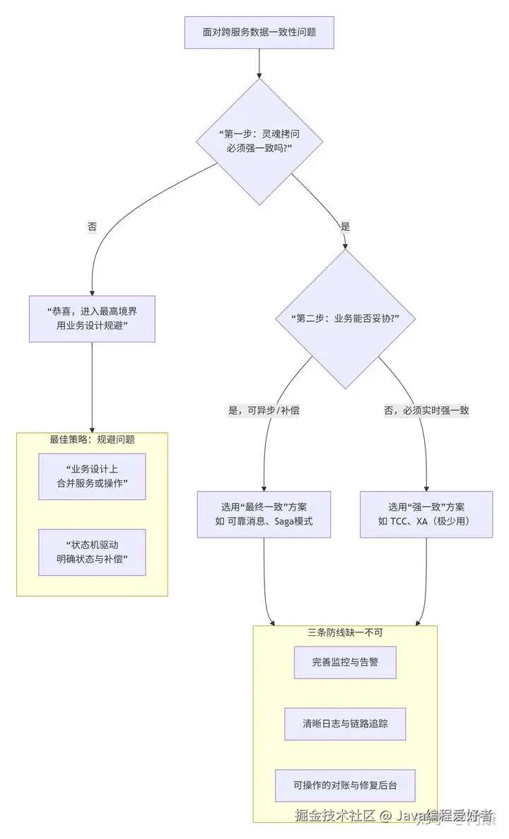 - 出具报告:明确划分,哪些链路是心脏,必须强一致(用TCC,报价高);哪些是四肢,可以接受最终一致(用可靠消息,报价中);哪些是头发,掉了无所谓(不处理,记录日志就行)。