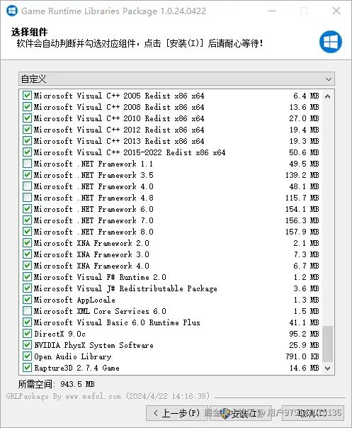 Game Runtime Libraries Package也是是一款游戏常用运行库合集,整合多个游戏会用到的运行库,支持XP、Win7、Win10、Win11等系统,支持自动检测系统勾选推荐的运行库,方便快捷。