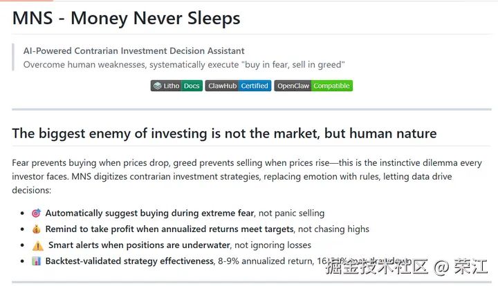 money-never-sleep技能详情见 OpenClaw 官方技能市场 OpenClaw / Hermes 技能:clawhub.ai/sopaco/mone… GitHub 源码:github.com/sopaco/mone…