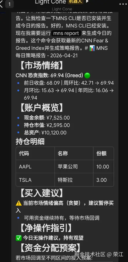 AI Agent 正在爆发。OpenClaw 提供了一个平台,让 Skill 开发者可以专注业务逻辑,AI 负责理解上下文、生成建议、解释结果。MNS 是这个生态里第一批”投资决策类” Skill 之一。