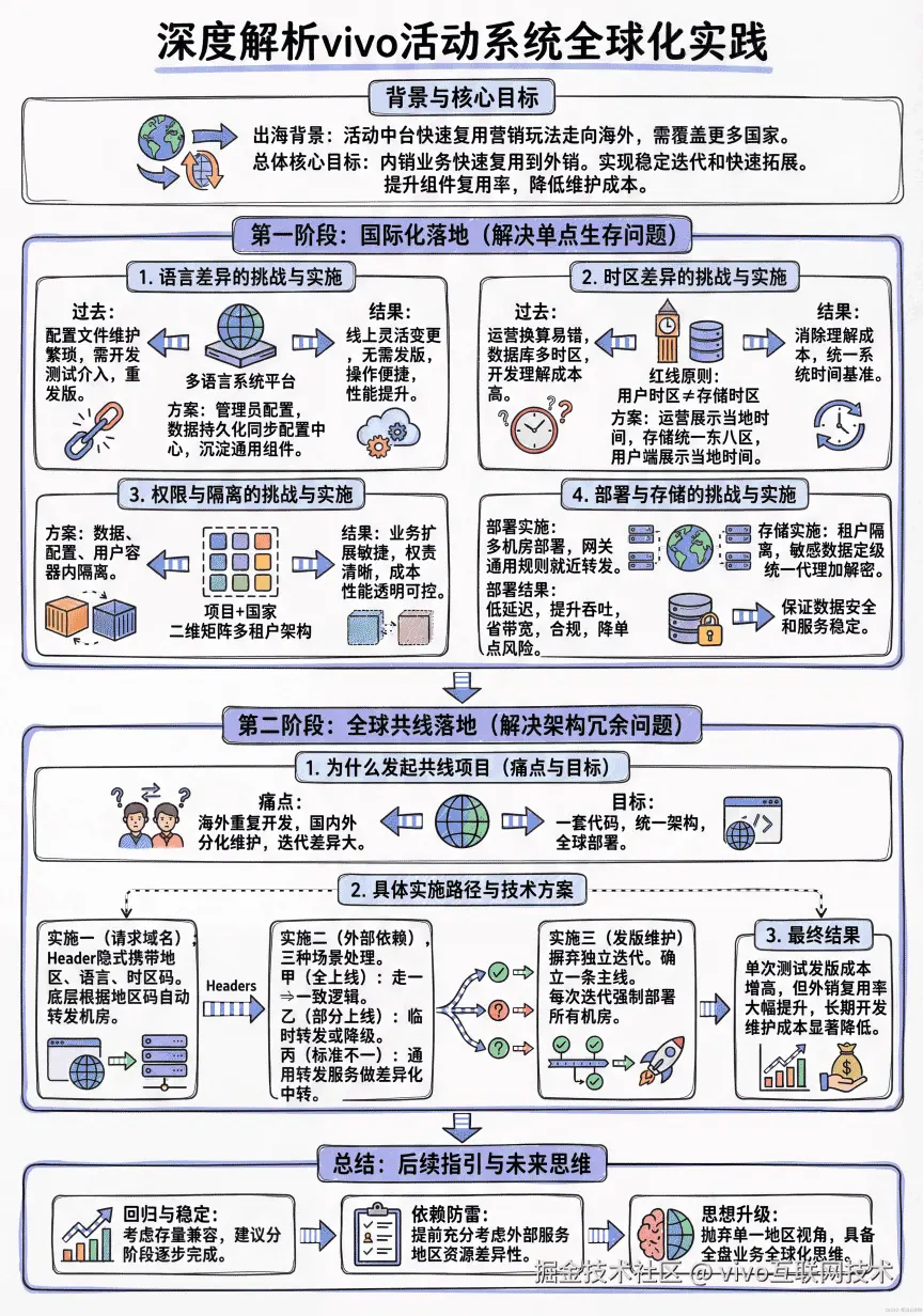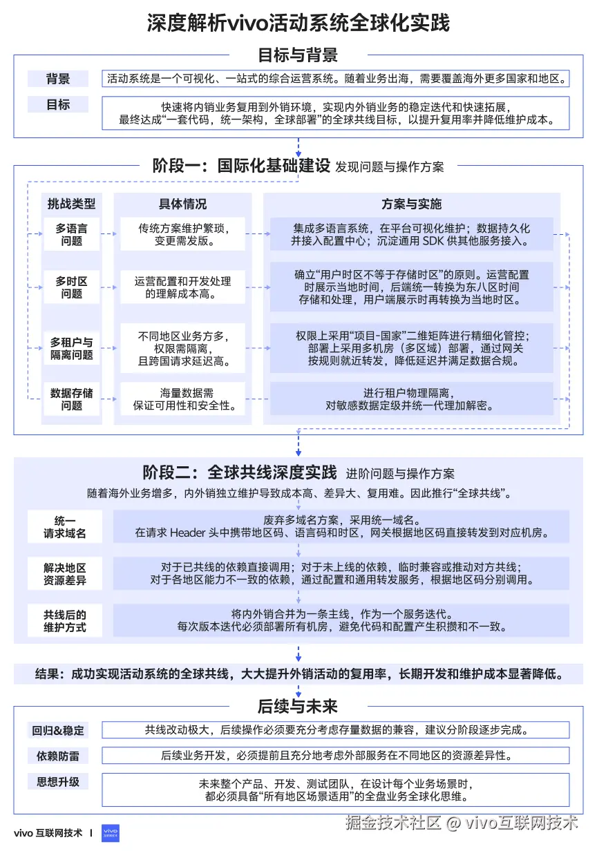 随着经济全球化的趋势,业务逐渐覆盖海外更多国家和地区,如何快速的将内销业务复用到外销环境,是业务走向国际化的必经之路,同时在内销服务和外销服务共存的场景下,做好内外销业务的稳定迭代和快速拓展是走向全球化的必要前提,对于中台业务,项目进行全球共线有着非常重大的意义,能够有效提升组件复用率,并降低服务维护成本,本文将详细介绍 vivo 活动系统的全球化实践过程。