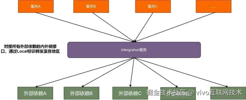 **场景三:**依赖的服务在对应地区已上线,但是每个地区的调用不一致,这是最复杂的场景,因为活动系统需要根据不同地区兼容依赖侧的差异性,这里为了减少共线服务中出现过多的定制化开发,可以将外部调用统一转发,根据不同的地区码调用相应的外部服务。
