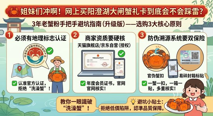 网上选阳澄湖大闸蟹礼卡就看这3个核心标准:地理标志认证 + 正规商家资质 + 可溯源防伪系统。