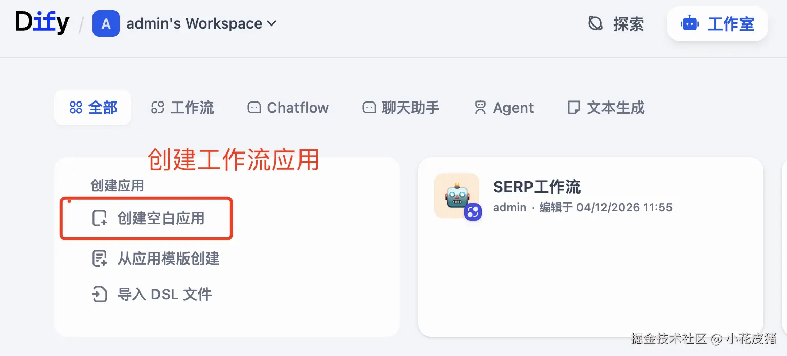 可以参考Dify官方创建工作流,这里我直接部署在本地然后进行创建,在”工作室“的菜单中点击“创建空白应用”。