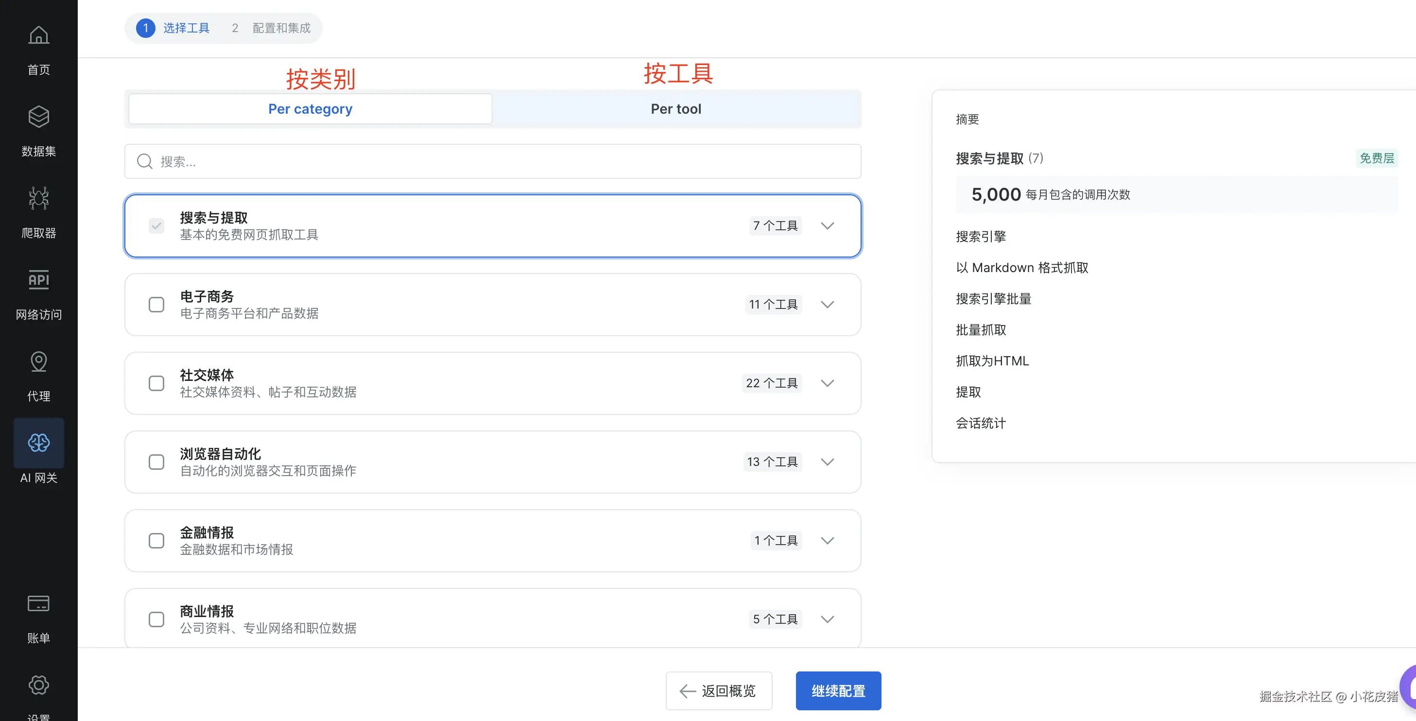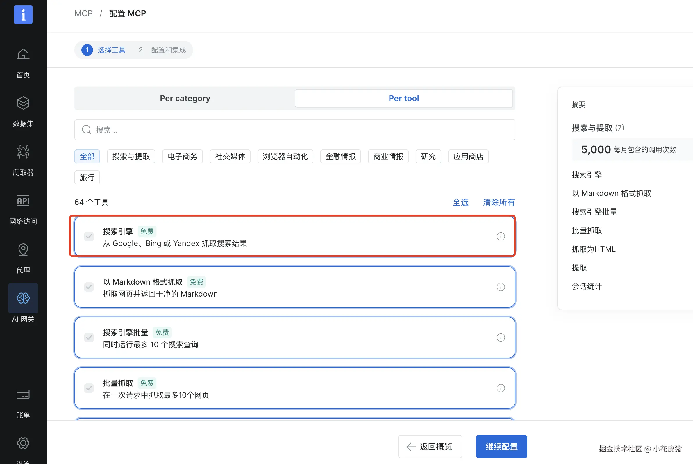 可以看到MCP配置可以根据类别、具体工具进行分类,这里直接点击继续配置就可以了