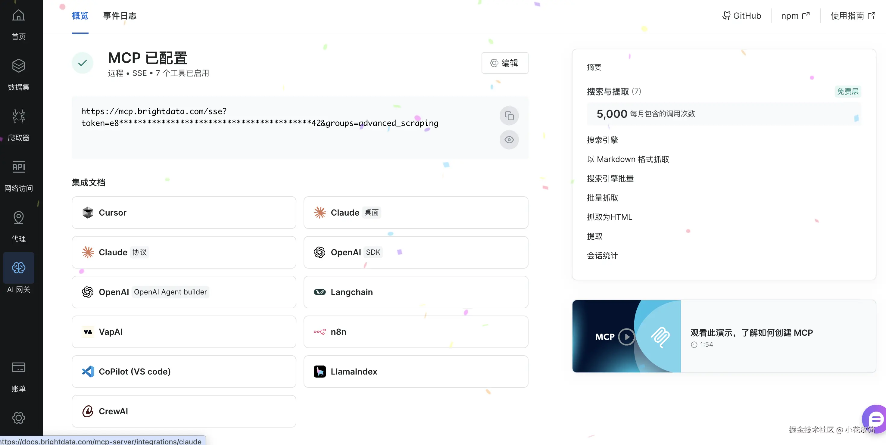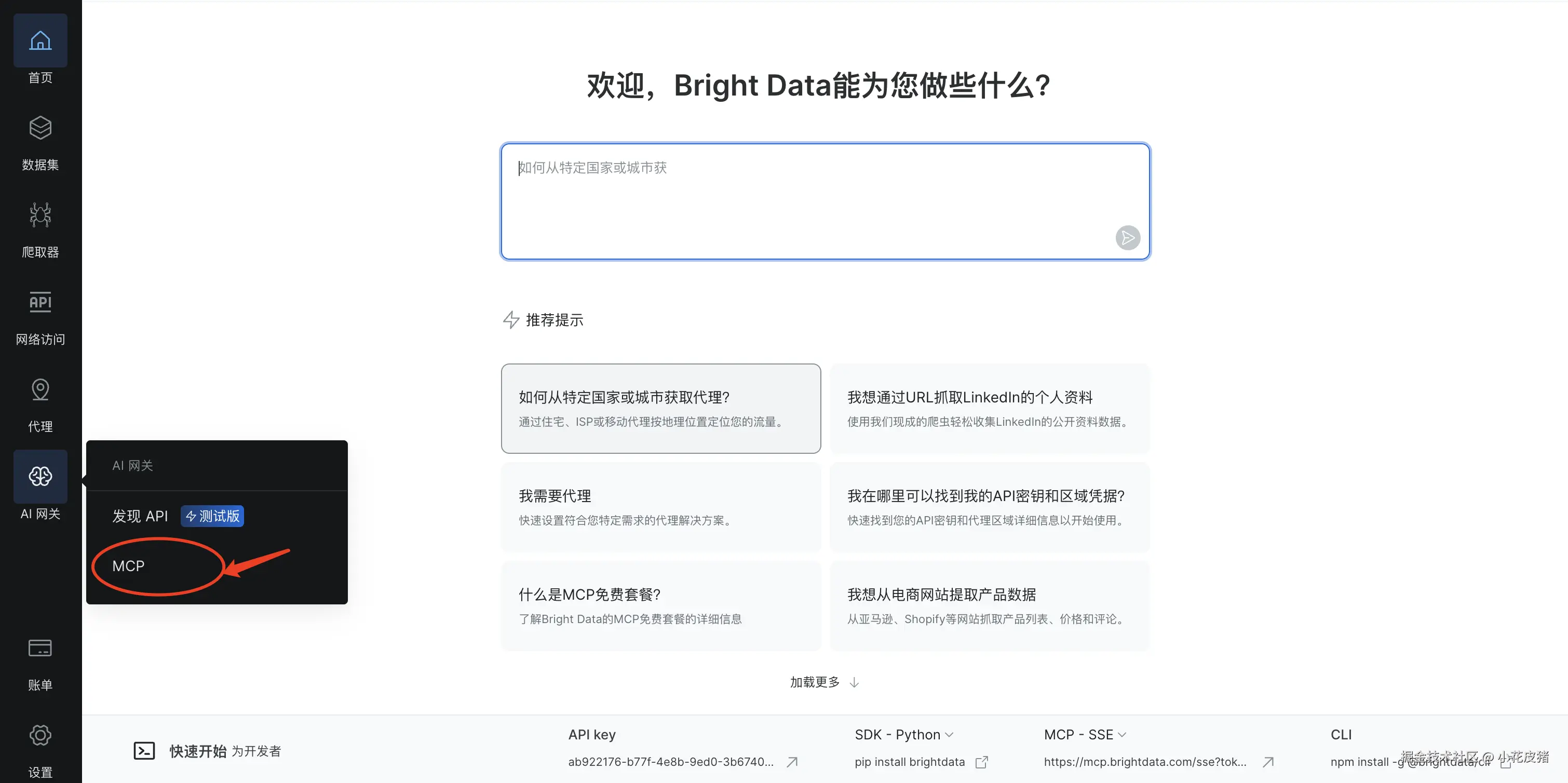 - Bright Data MCP Server API Token:登录Bright Data控制台,进入MCP配置页,获取API Token和MCP Endpoint(后续会详细讲解配置步骤)。