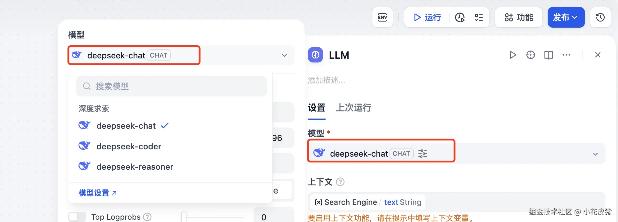 在MCP节点之后,设置LLM节点,这里模型选择“deepseek-chat”,如果没有设置模型的API KEY的话需要进行授权