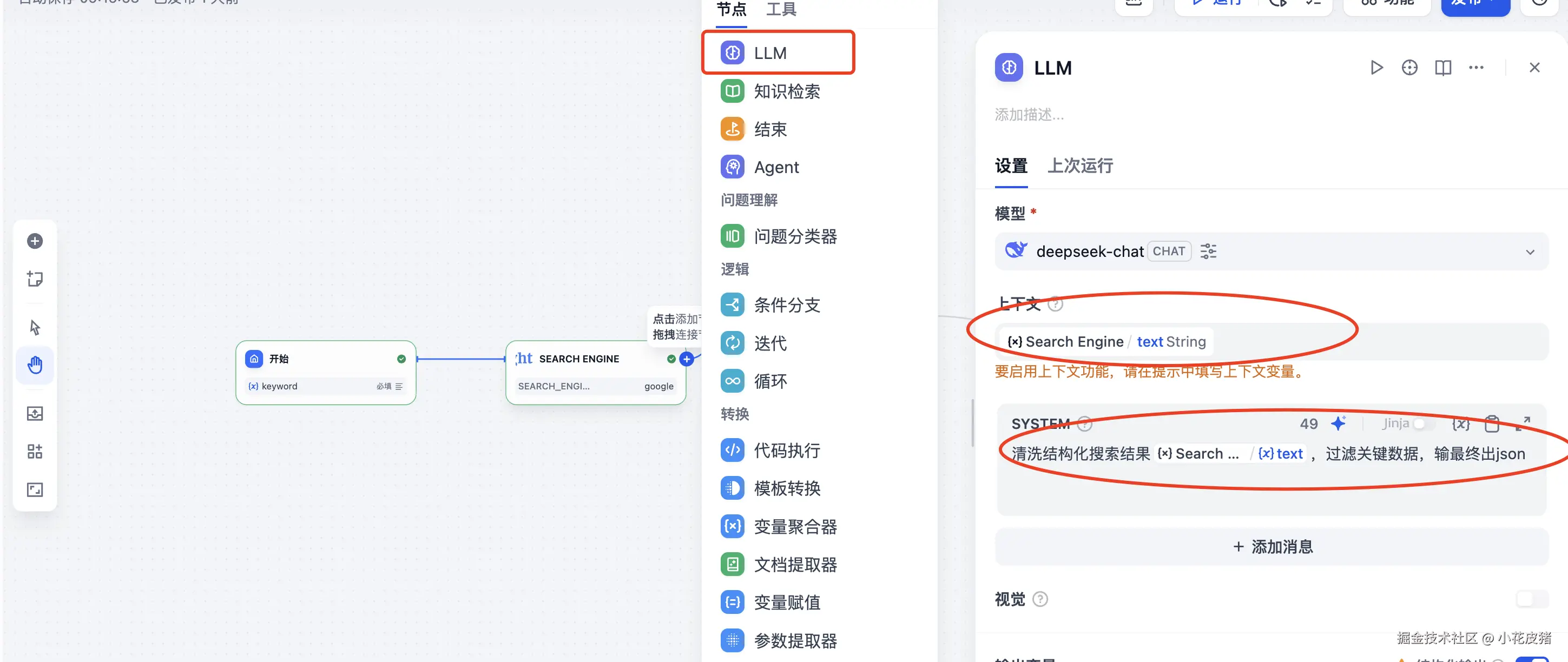 还需要设置上下文为MCP节点的输出,以及对LLM的提示词为“请将内容清洗结构化搜索结果,最终以训练数据集格式输出”