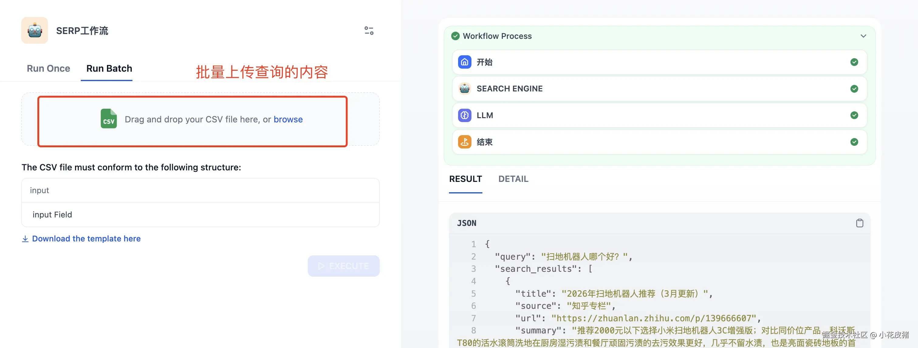 - 用户输入:批量SERP关键词列表(可手动输入或上传文件);