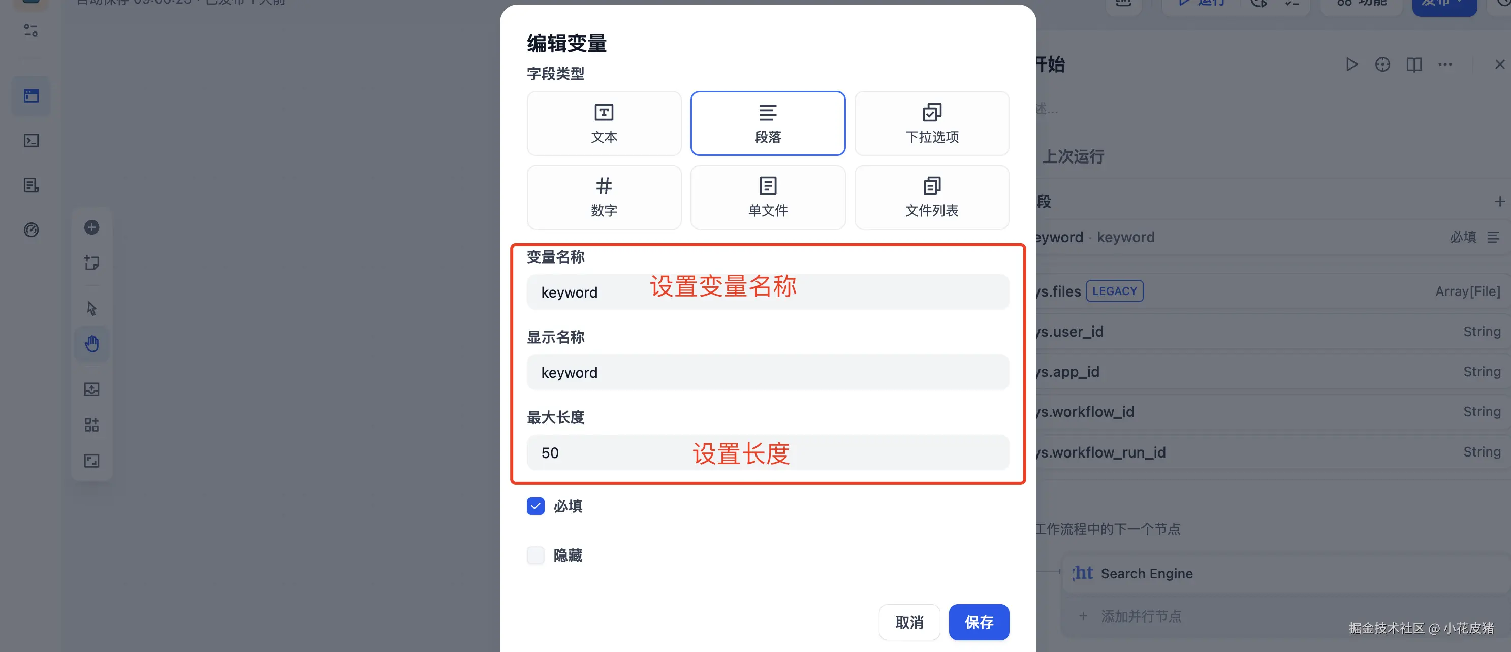 随后我们可以进行设置文本、段落、下拉选项、数字、单文本、文件列表等变量,这我选择段落,设置变量名称“keyword”以及最大长度“50”