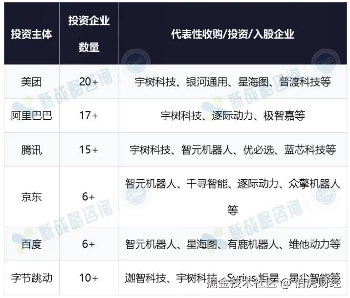 据“新战略具身智能”报道,美团累计投资企业数量最多,超过20家企业,紧随其后的是阿里(17+)、腾讯(15+)、字节(10+),京东和百度各自投资了6+家企业。