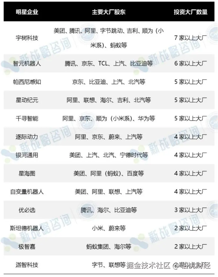 比如在今年4月被曝已完成近20亿元B轮融资的自变量机器人,同时获得了阿里、字节、美团和小米四家大厂押注;明星独角兽宇树科技背后,更站着7家以上的大厂。