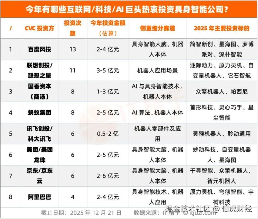 互联网和科技大厂,绝对是其中的核心力量。根据IT桔子《具身智能赛道2025年CVC投资格局分析》, 8家核心大厂全年投资次数合计达62次,总额在14.5亿-34亿之间。