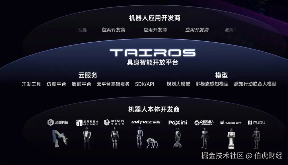 去年7月,腾讯机器人实验室RoboticsX发布了具身智能开放平台Tairos“钛螺丝”,这是国内首个以模块化的方式提供大模型、开发工具和数据服务的具身智能软件平台,成为机器人“躯体”和“大脑”之间的链接平台。
