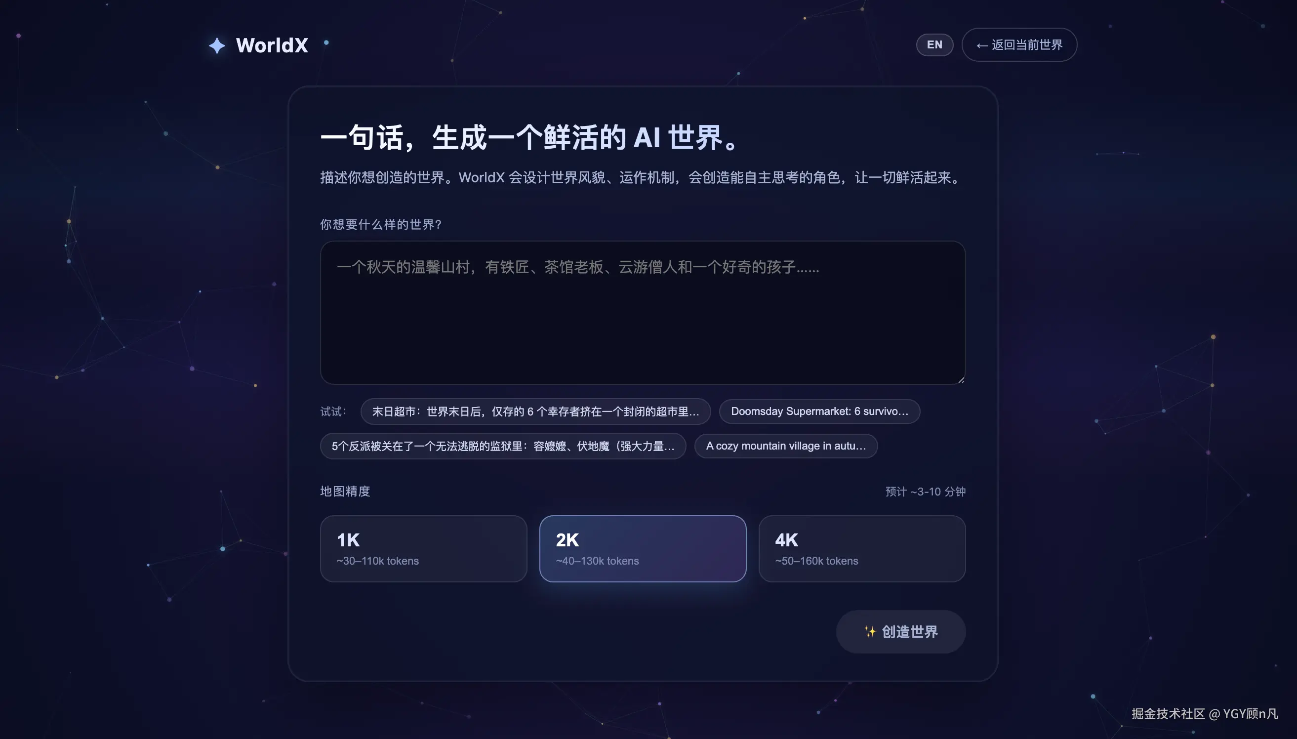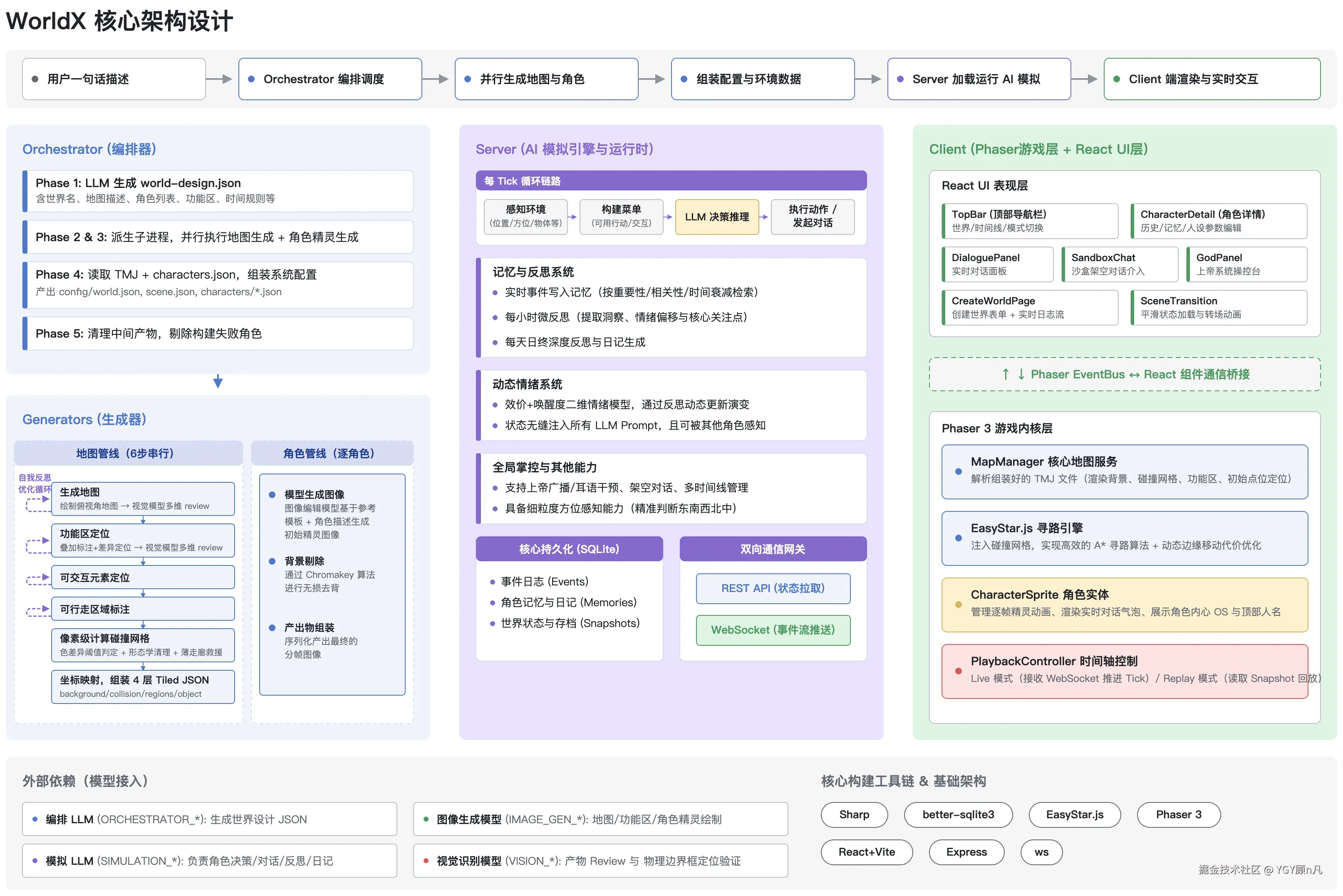 它叫做“WorldX”,只需要输入一句话要求,Agent就能自主构思全部背景、设定规划“创世”任务,然后绘制世界地图、定位可交互元素、绘制角色立绘和动画分帧,然后组装起来,形成一个可以自主运转的小世界!