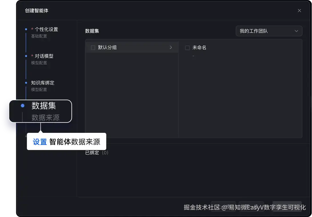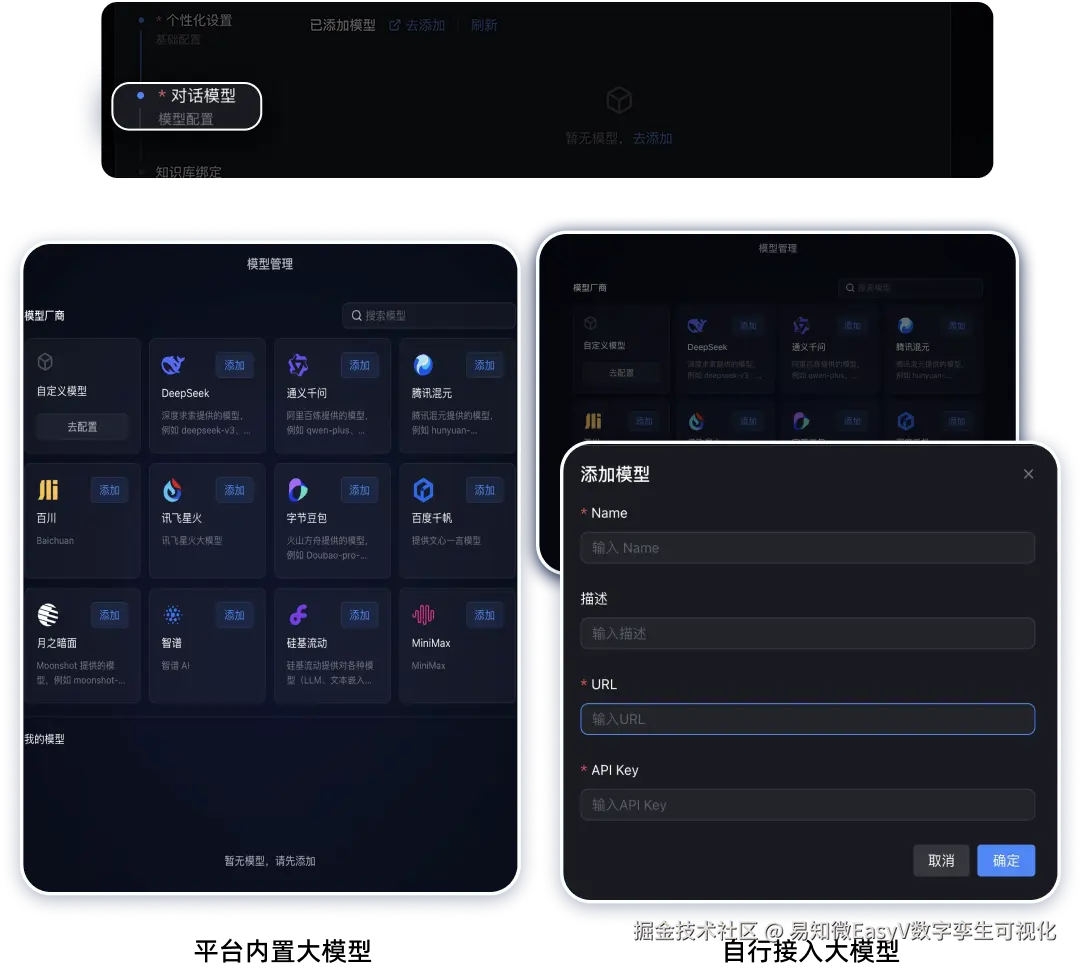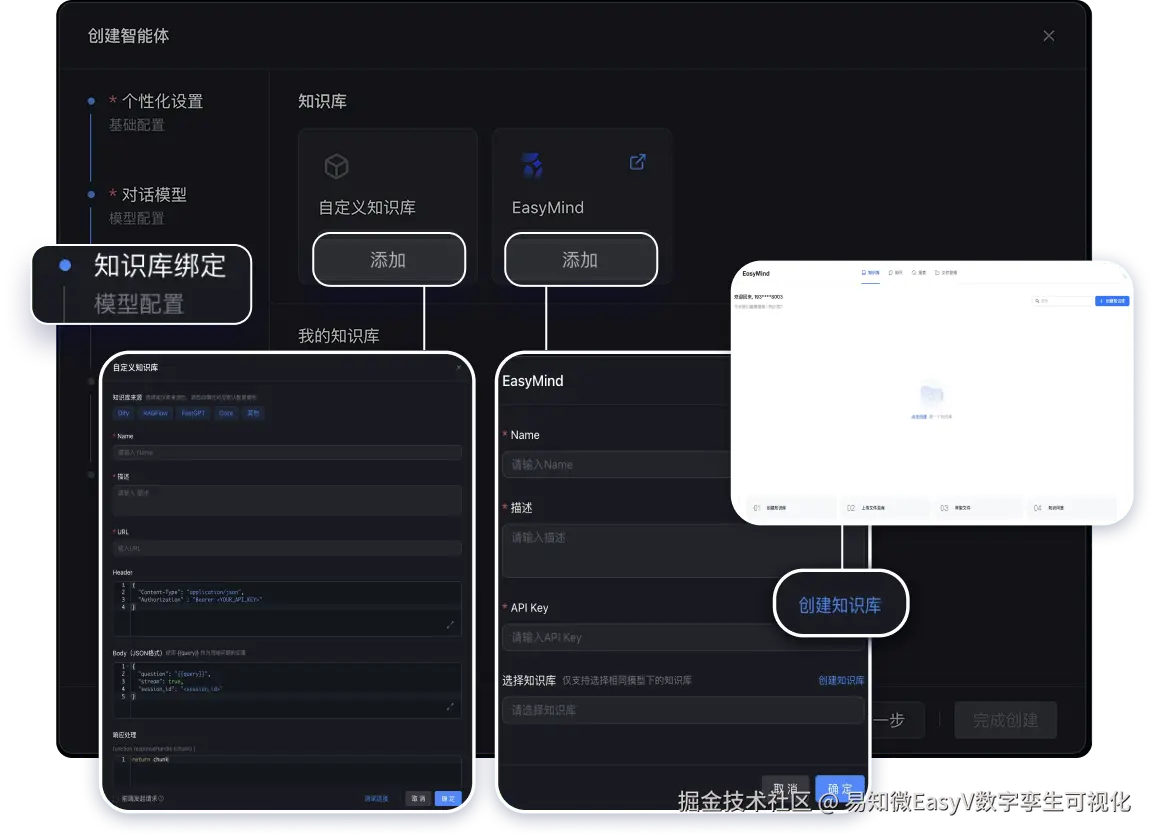 在使用过程中,用户可以基于 EasyV 快速完成 AI 智能体的创建,根据业务需求完成名称、形象、设定等基础配置。支持结合实际场景选择平台内置主流大模型或对接第三方模型,进一步接入业务知识库、绑定本地数据集,在更贴近业务语境的前提下,实现实时问答、信息查询与数据调用。