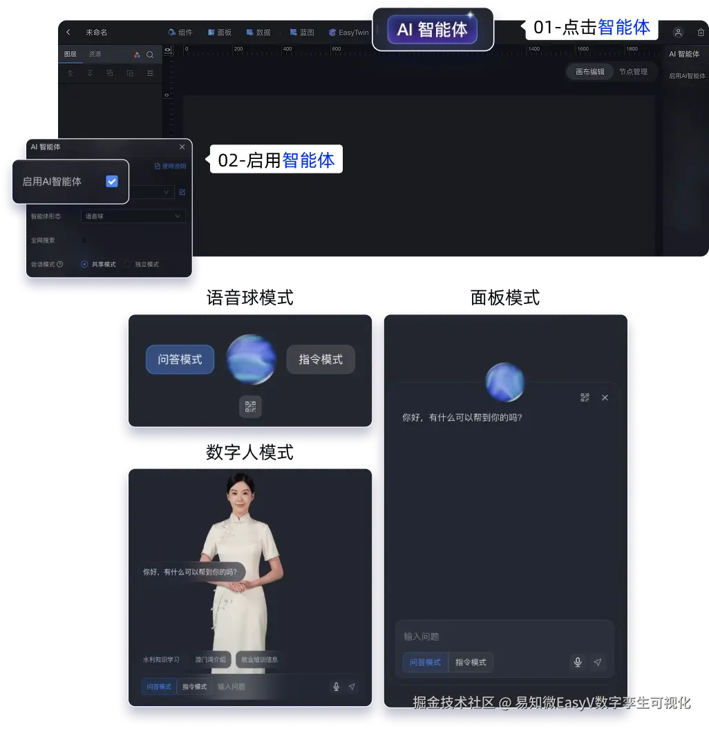 EasyV「AI智能体」,赋能数字孪生智能升级,高效支撑数据、知识等业务要素的对话式信息问答和统计分析。同时,支持联动 EasyHuman,搭载数字人形象支撑业务应用,满足展示接待、业务咨询等对外展示需求,为数智应用提供更加自然、高效的人机交互体验。