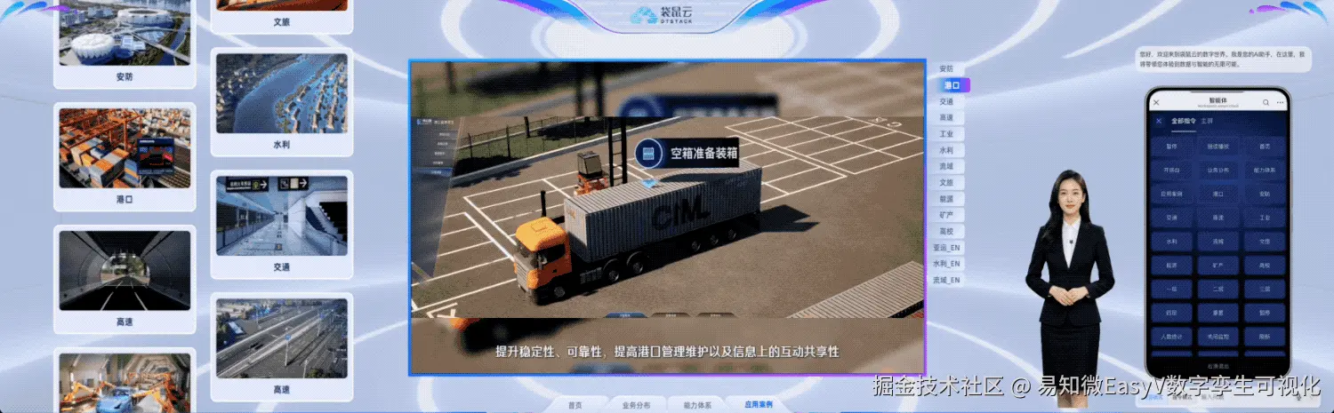 以政务大厅场景为例:当接待人员为政府领导时,AI 智能体能够跟随指令同步调取业务信息,讲解关键指标;当接待人员为合作伙伴时,AI 智能体能够即时响应并调整展示路径,快速切换至参观人员所关注的子场景页面。