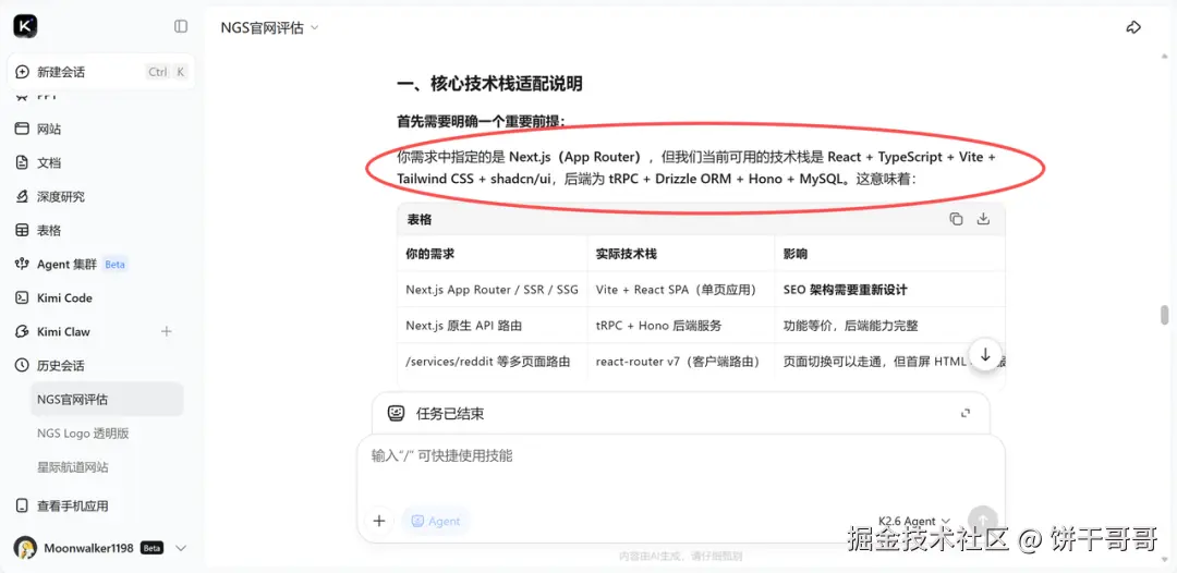 它的回复里有一句话:「你需求里指定的是 Next.js,但我们当前可用的技术栈是 React + Vite,后端是 tRPC + Drizzle ORM + Hono + MySQL。」