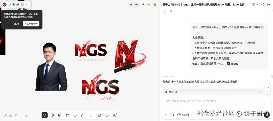 于是我用 Lovart 基于 NGS 的 Logo 先跑了三张素材:酷炫科幻风格的 NGS logo、带帆船元素的品牌图、创始人西装数字人。