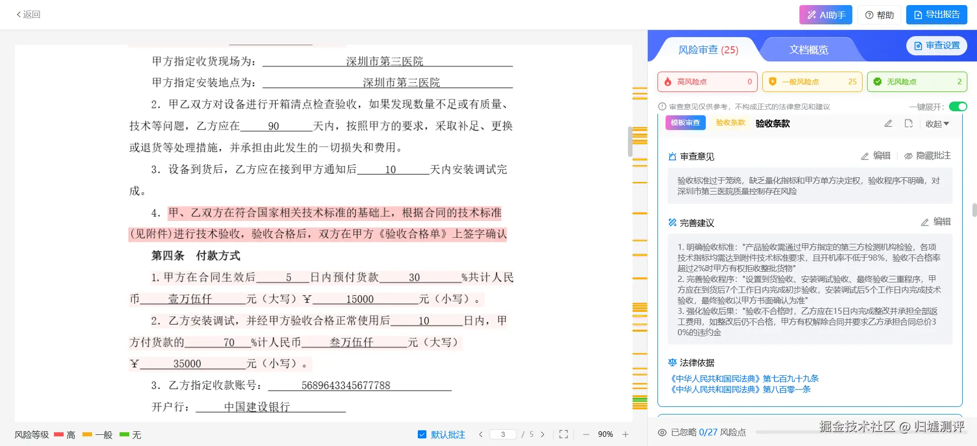 火眼审阅内置了基于海量法律数据和实务经验的风险规则库。系统能自动对识别出的条款进行风险等级评定,并清晰指出具体风险所在。